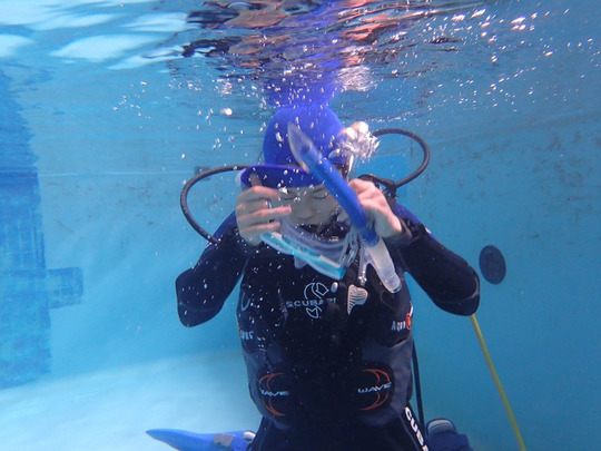 まず一通りにスクーバー器材の組み立て、取り外しから始めていきます。 また、中性浮力をとる練習やマスククリアー・リカバリー、レギュレータークリアー ・リカバリーなどを始めとする皆さんが初めてCカード取得する時に限定水域で学んだスキルを復習します。